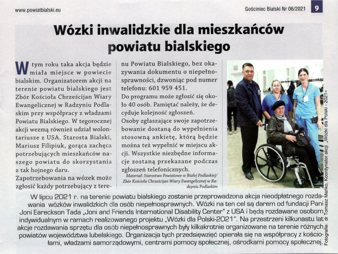 ukazał się artykuł poświęcony akcji rozdawania wózków inwalidzkich dla mieszkańców powiatu bialskiego.